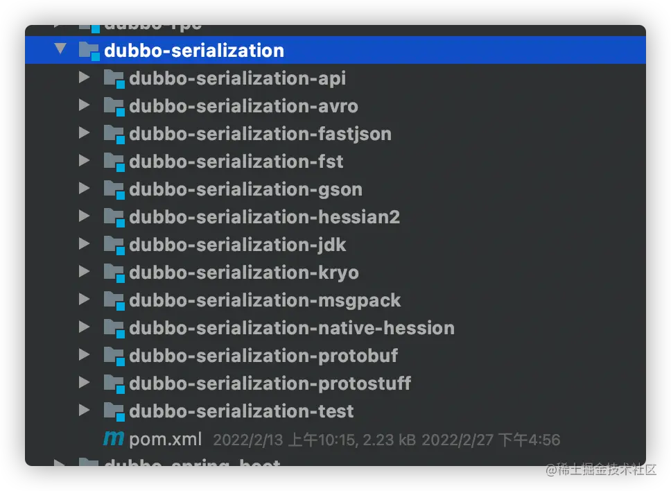 Dubbo支持多种序列化方式,比如hessian、kryo、pb等。看源码包dubbo-serialization可以看到不同的序列化方式实现原理: