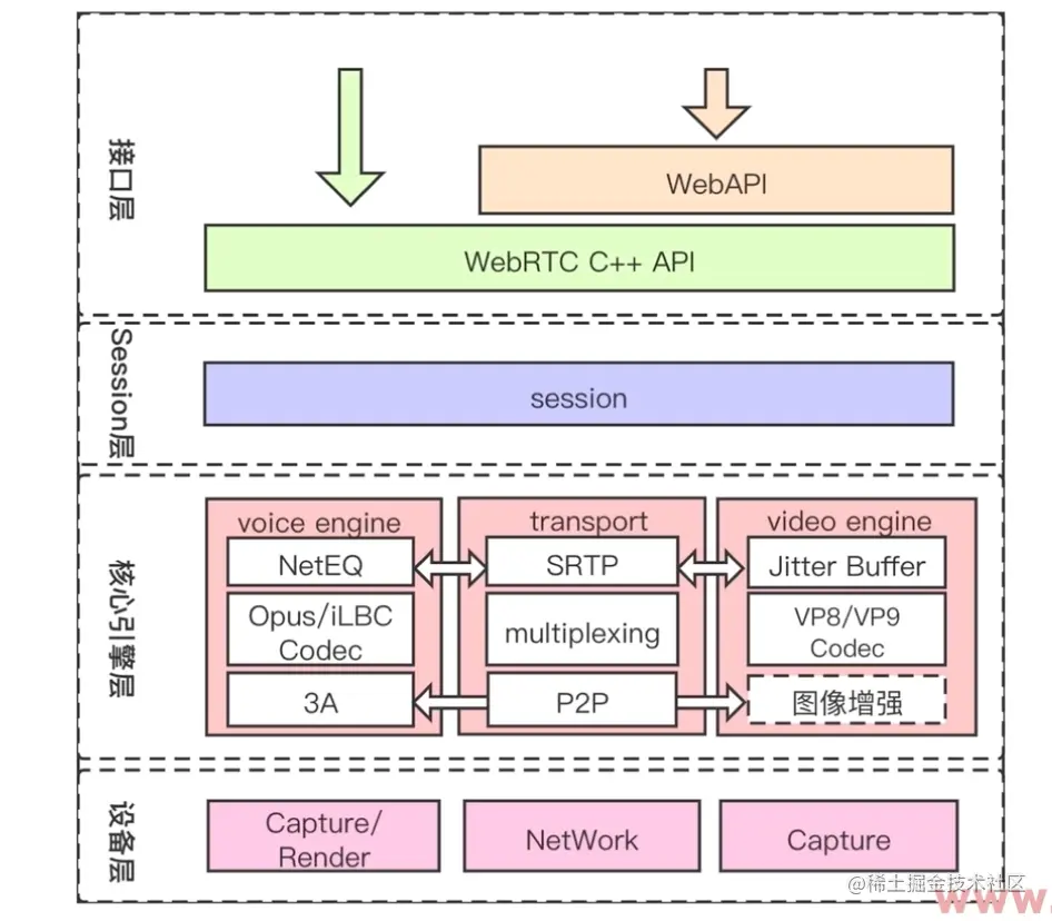 核心引擎层 : 音频引擎、视频引擎、传输引擎(SRTP 保证数据安全、多路复用、P2P Nat穿越)