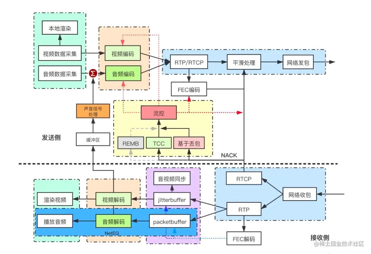 采集 - 编码 - 缓冲 - 进入传输层 - SRTP 保证数据的安全性 - 多路复用 - P2P