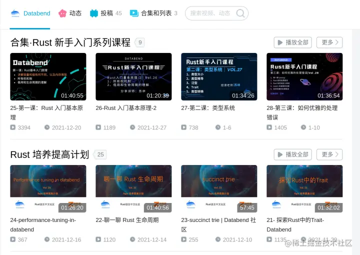 面向 Rustacean 和数据库开发人员的公开课 自 2021 年 8 月起,Databend 和 Rust 中文社区、知数堂,启动了面向 Rustacean 和数据库开发人员的公开课计划。 截至目前,已经发布 25 期 Rust 提高培养计划,以及 9 期 Rust 新手入门课程。累计播放 45000 次,获赞 939 次。