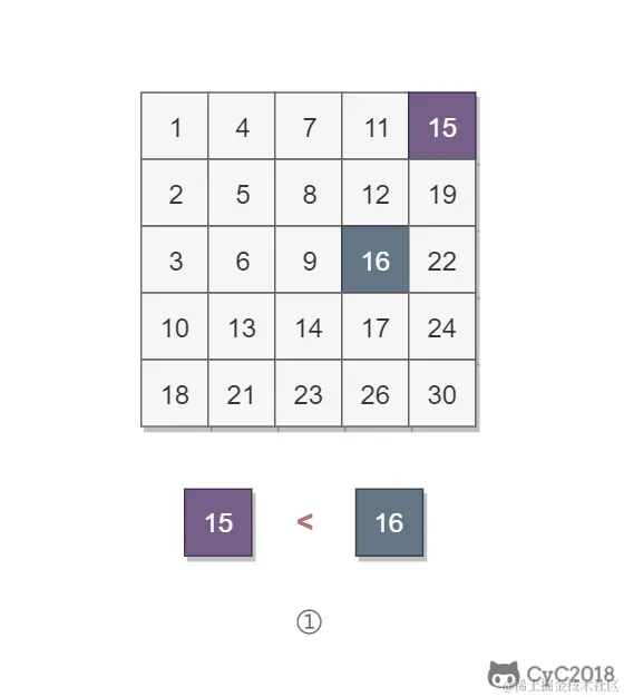 该二维数组中的一个数,小于它的数一定在其左边,大于它的数一定在其下边。因此,从右上角开始查找,就可以根据 target 和当前元素的大小关系来快速地缩小查找区间,每次减少一行或者一列的元素。当前元素的查找区间为左下角的所有元素。