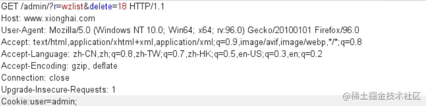 然后我们换个浏览器,来访问这个payload,并且抓包,在Cookie处,添加user的值为admin