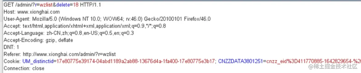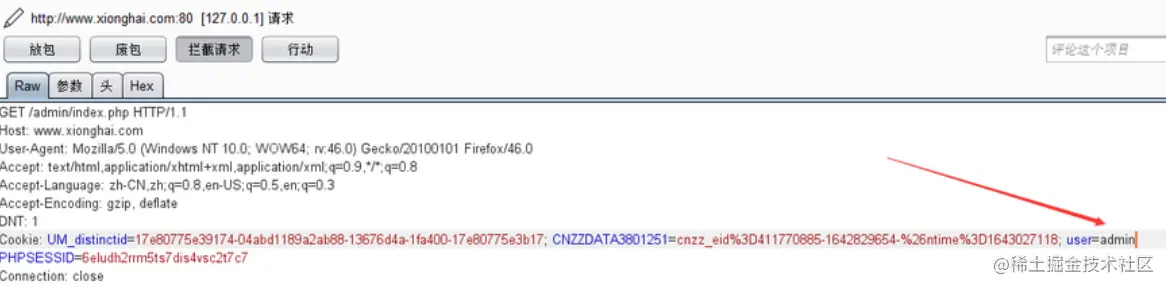 我们访问www.xionghai.com/admin/index…抓包查看,这种情况,COOKIE中无user参数
