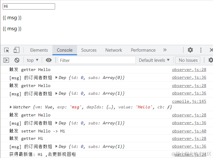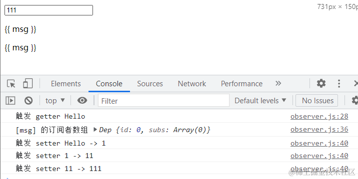 由于我们在initData()方法中已经添加了Observer,我们在控制台就已经能看到data.msg的订阅者数组,调用_getVal()方法时触发了getter,手动在 input 框输入内容导致data.msg改变的时候触发setter。