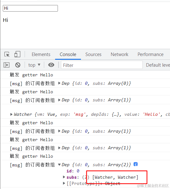 完成之后可以看到 input 框中初识显示的“Hello”,在2s后自动修改为“Hi”,控制台也能看到订阅者里面已经成功添加了一个Watcher。这样我们v-model指令就已经完成了。