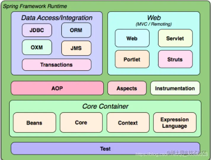 - Data Access/Integration层包含有JDBC、ORM、OXM、JMS和Transaction模块。