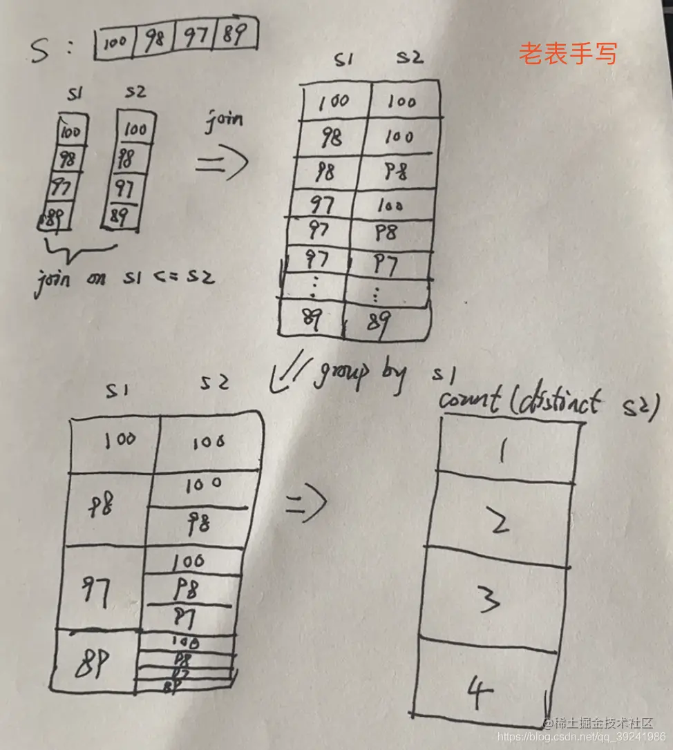 三玫提供了另外一种找第二高薪水的方法,通过salaries自连接,连接条件是s1.salary <= s2.salary,这样后,再根据s1.salary分组,然后count(distinct s2.salary) = 2就是第二高薪水。