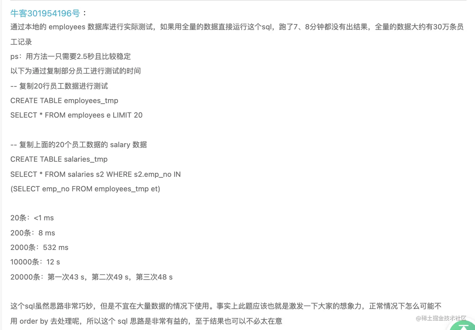 评论区也有人做了效率对比,当数据量上升时,该方法效率会大大降低,其实原因也很简单,salaries变大,自连接自然会消耗大量时间。