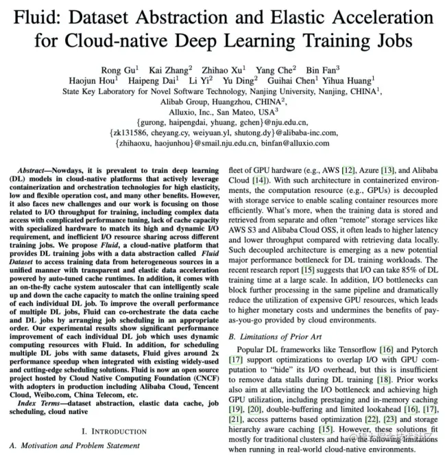 此次被录用的论文–《Fluid: Dataset Abstraction and Elastic Acceleration for Cloud-native Deep Learning Training Jobs》,针对云原生环境下运行深度学习训练作业往往面临 I/O 方面的性能挑战,提出了新的数据集抽象和弹性加速系统架构,通过数据集特性自动优化的缓存引擎来加速数据的访问。其作者主要来自阿里云云原生团队和南京大学计算机系。