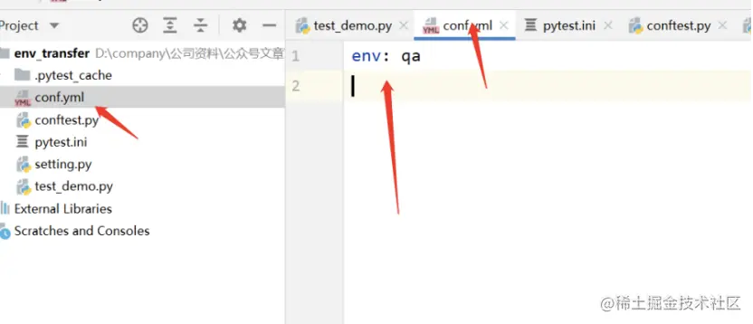 通过 yml文件 和 fixture 进行配合使用,首先在项目目录下面创建一个conf.yml,然后里面去手动配置现在要运行的环境,截图如下: