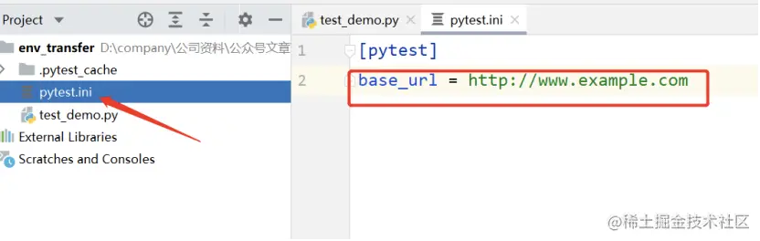 第2种使用方式是在pytest.ini配置文件种去配置base_url,然后自动读取url的数据,这样就不用添加--base-url这个命令行参数了: