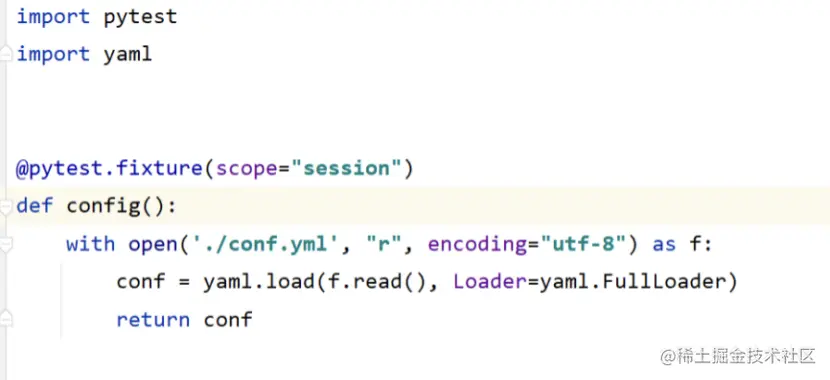 然后在创建一个conftest.py,里面定义两个fixture函数,一个用来读取conf.yml里面的内容,另一个用来配置具体的环境信息