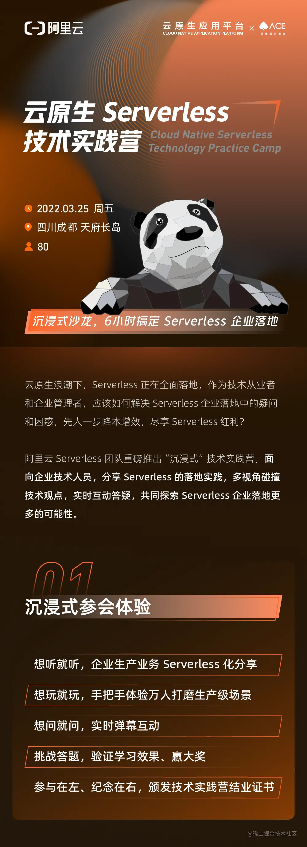 云原生浪潮下,Serverless 正在全面落地。继「云原生 Serverless 技术实践营」广州站、南京站、顺利举办后,虎兆丰年,阿里云 Serverless 团队把 “沉浸式” 技术实践营带到芙蓉锦城—四川成都,邀你一起共赴这场春日之宴。