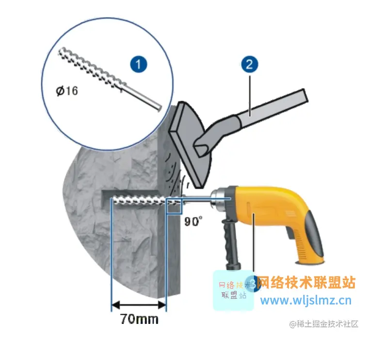 1、在垂直墙面打孔