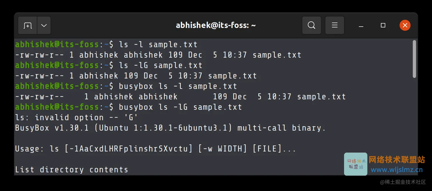 BusyBox 减少了很少使用的选项,例如,ls 命令具有选项 G,它从长列表输出 (ls -l) 中删除组名。