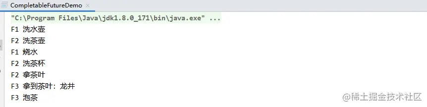 为了方便采用CompletableFuture实现,将最优泡茶方案进一步细分,如下所示,将流程拆分三个线程执行,线程F3需要等待线程F1,F2都返回后才执行。