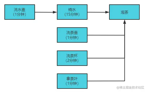 先从之前提到的华罗庚提出的最优泡茶问题入手,简易体验下CompletableFuture工具类的优势。 最优泡茶问题可以分为如下步骤