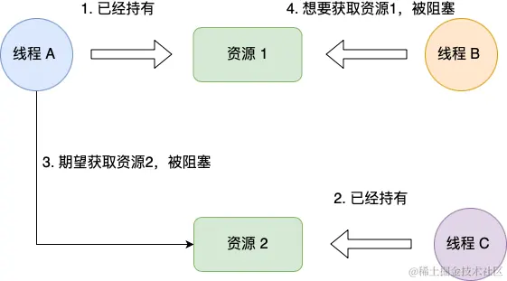 比如,线程 A 已经持有资源 2,而想请求资源 1, 线程 B 已经获取了资源 1,而想请求资源 2,这就形成资源请求等待的环形图。