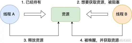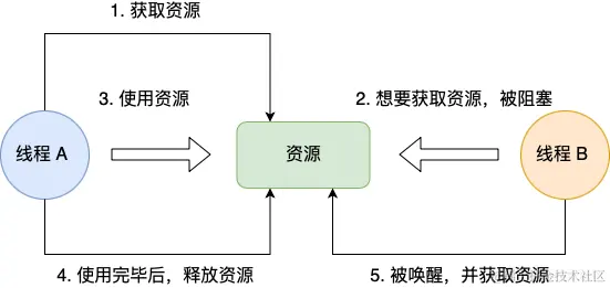 比如下图,如果线程 A 已经持有的资源,不能再同时被线程 B 持有,如果线程 B 请求获取线程 A 已经占用的资源,那线程 B 只能等待,直到线程 A 释放了资源。