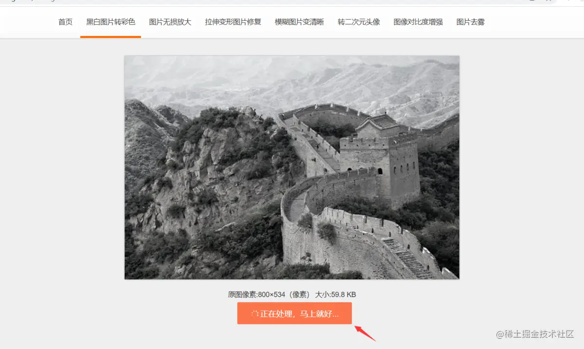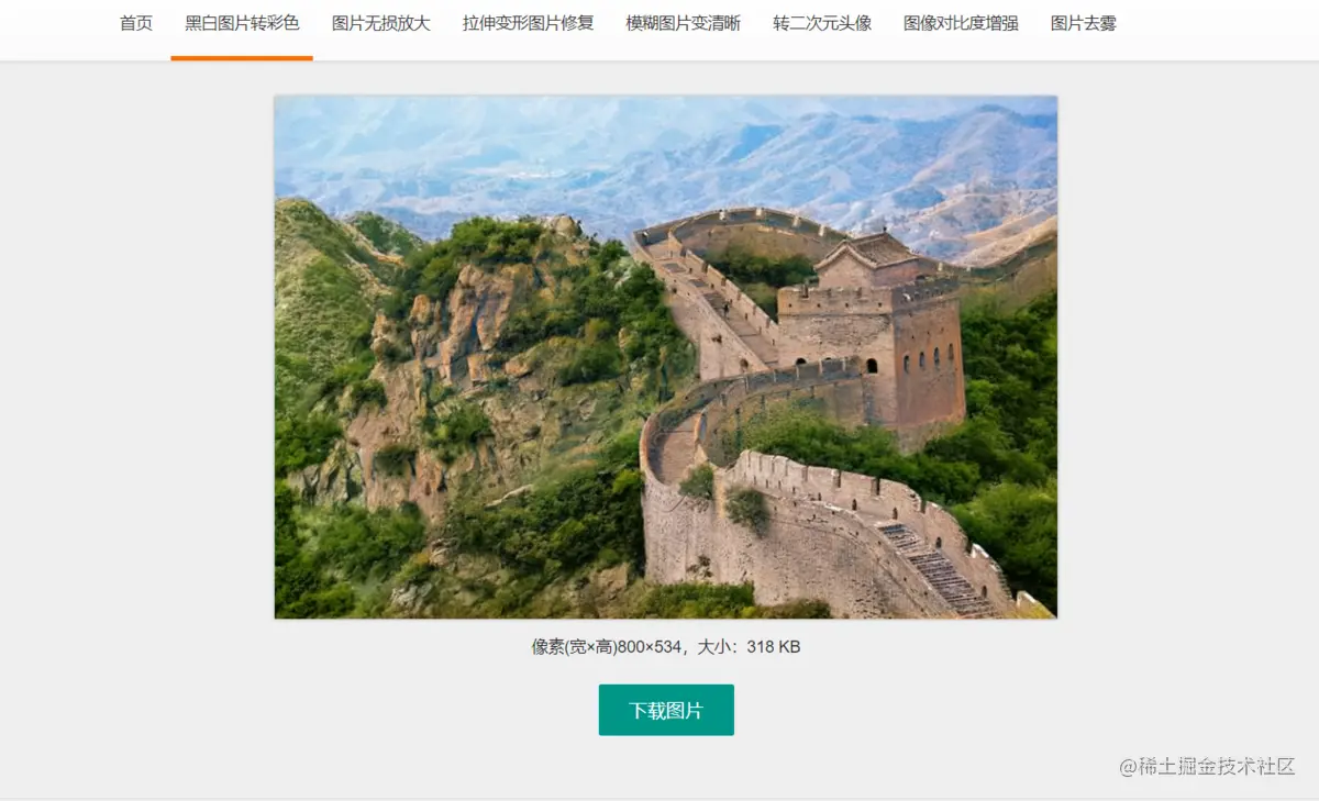 才不到5秒就自动上色了,非常智能,能够自动识别需要上色的物体,并还原对应的色彩,比如树木是绿色的。长城是棕色的,天空是蓝色的,是不是非常神奇呢。