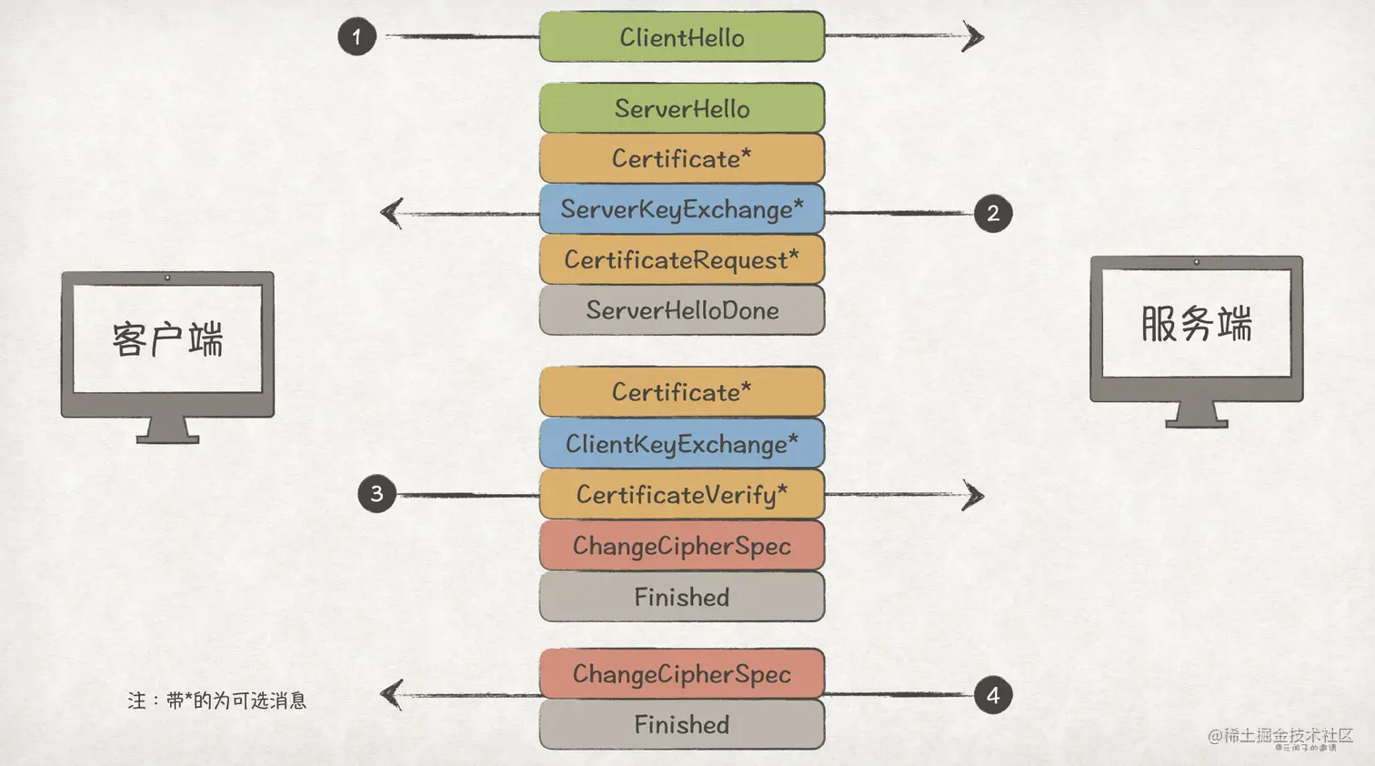 Handshake 协议包含了如下几种报文类型:ClientHello、SeverHello、Certificate、ServerKeyExchange、CertificateRequest、ServerHelloDone、ClientKeyExchange、CertificateVerify、ChangeCipherSpec、Finished。