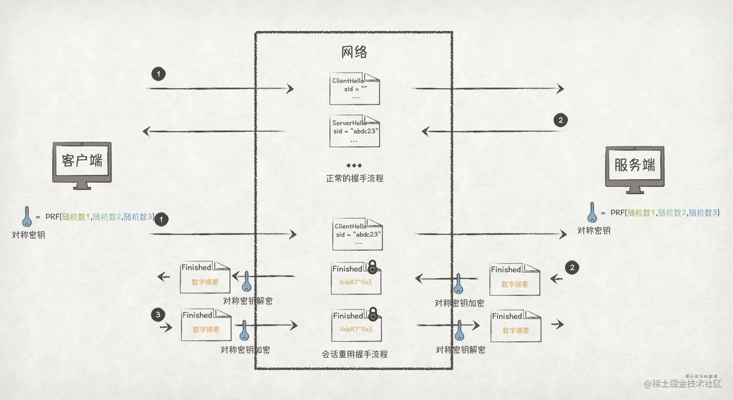 因为经历过一次握手之后,密钥已经协商好,并且双方都保存了下来。下次连接建立时,完全可以沿用上次握手协商好的密钥,从而避免了重新协商密钥,提升了性能。我们需要一种重用会话的机制来提升协议的性能......