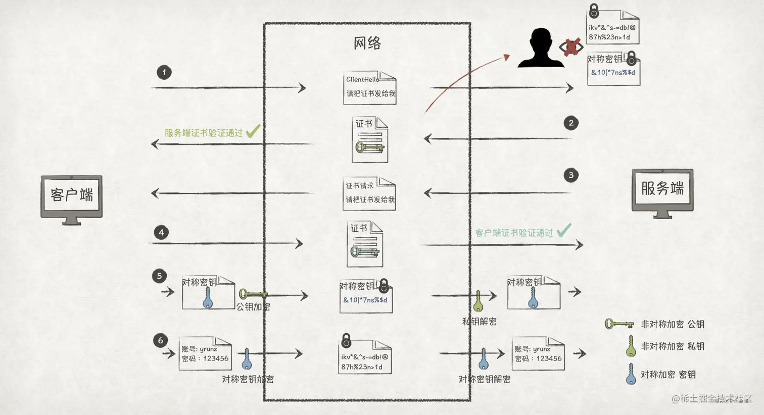 使用对称加密+非对称加密算法的方案,我们消除了窃听风险,也不会存在加解密性能问题,但是还是无法消除冒充风险。