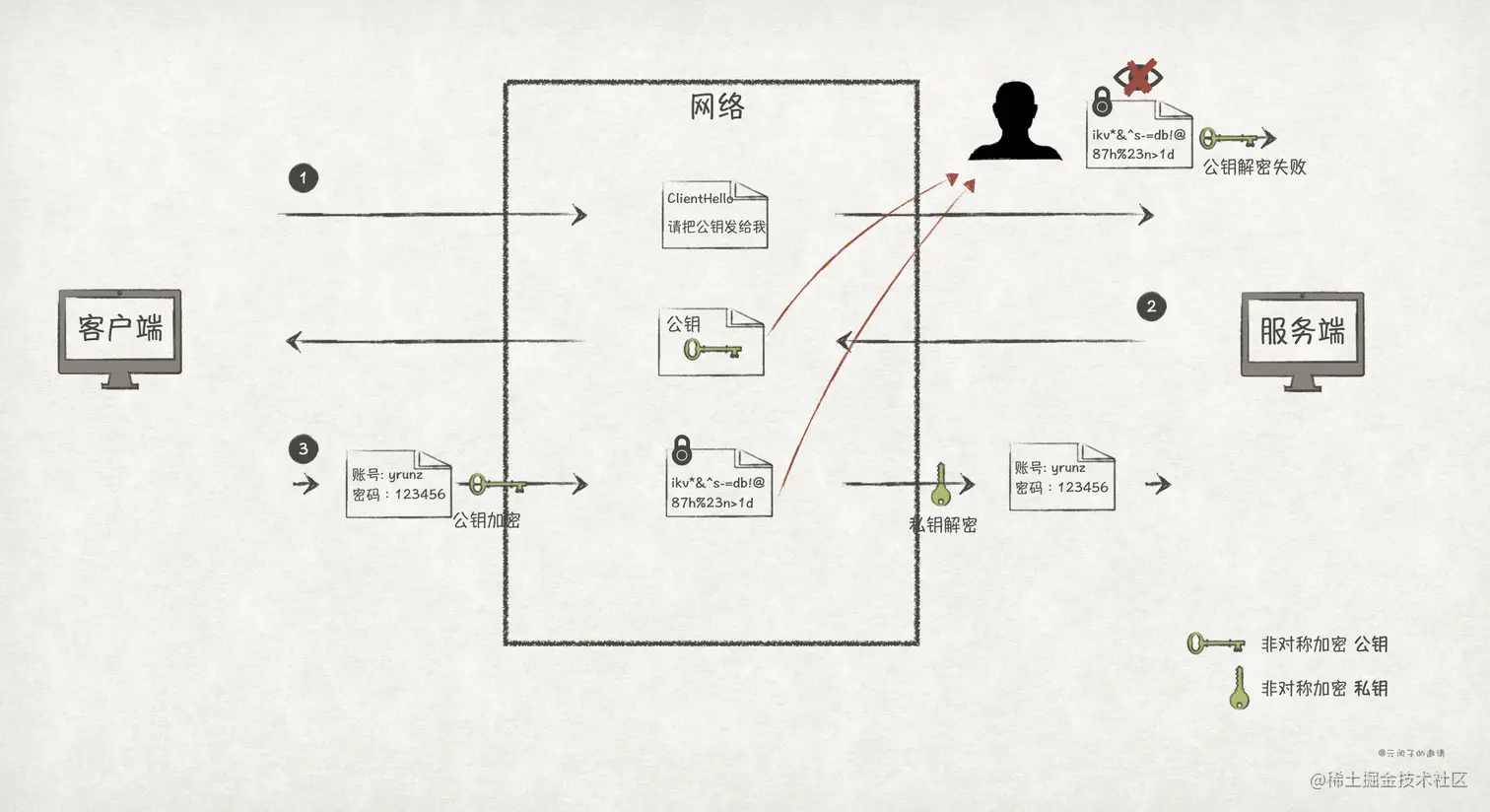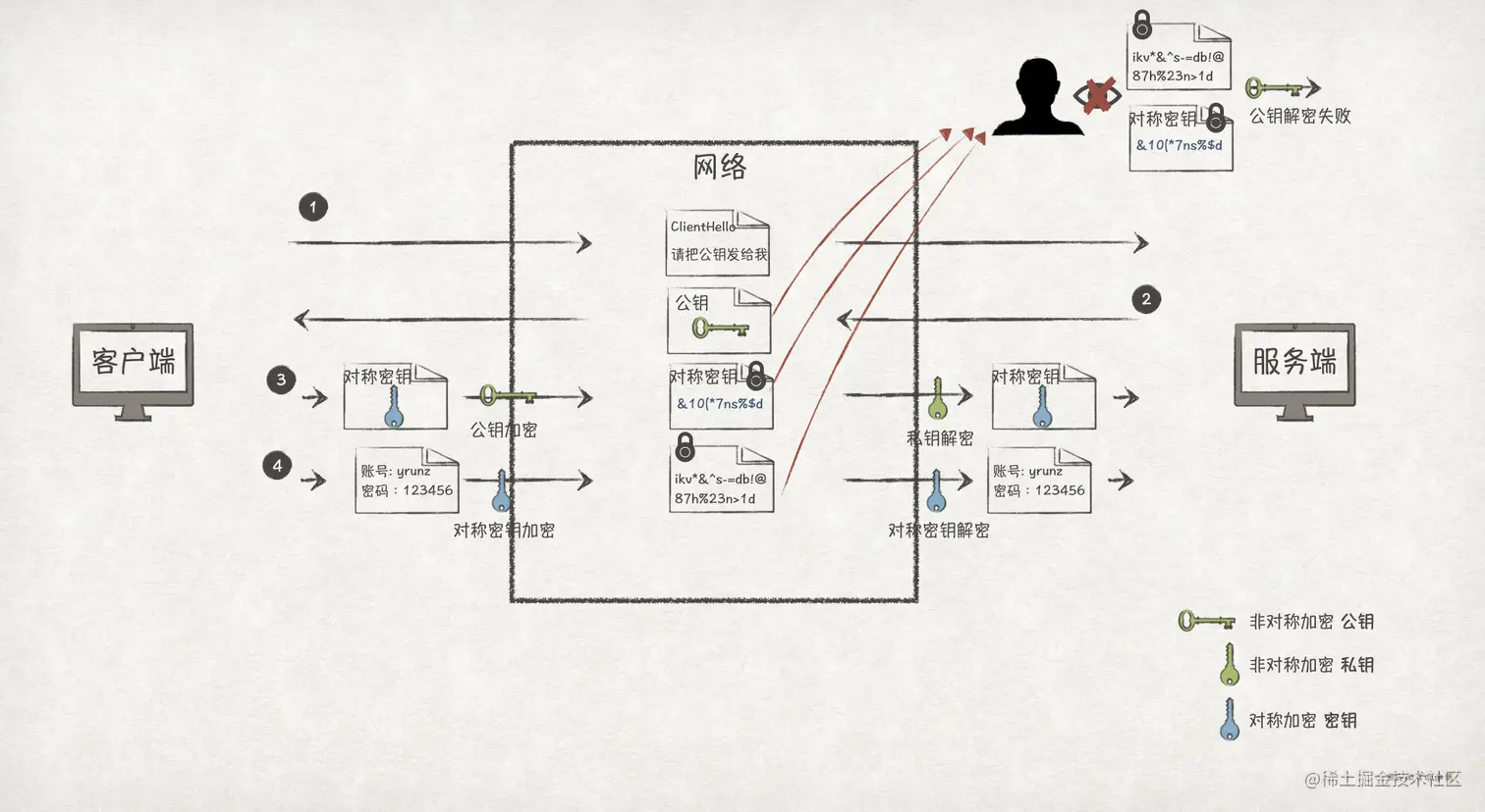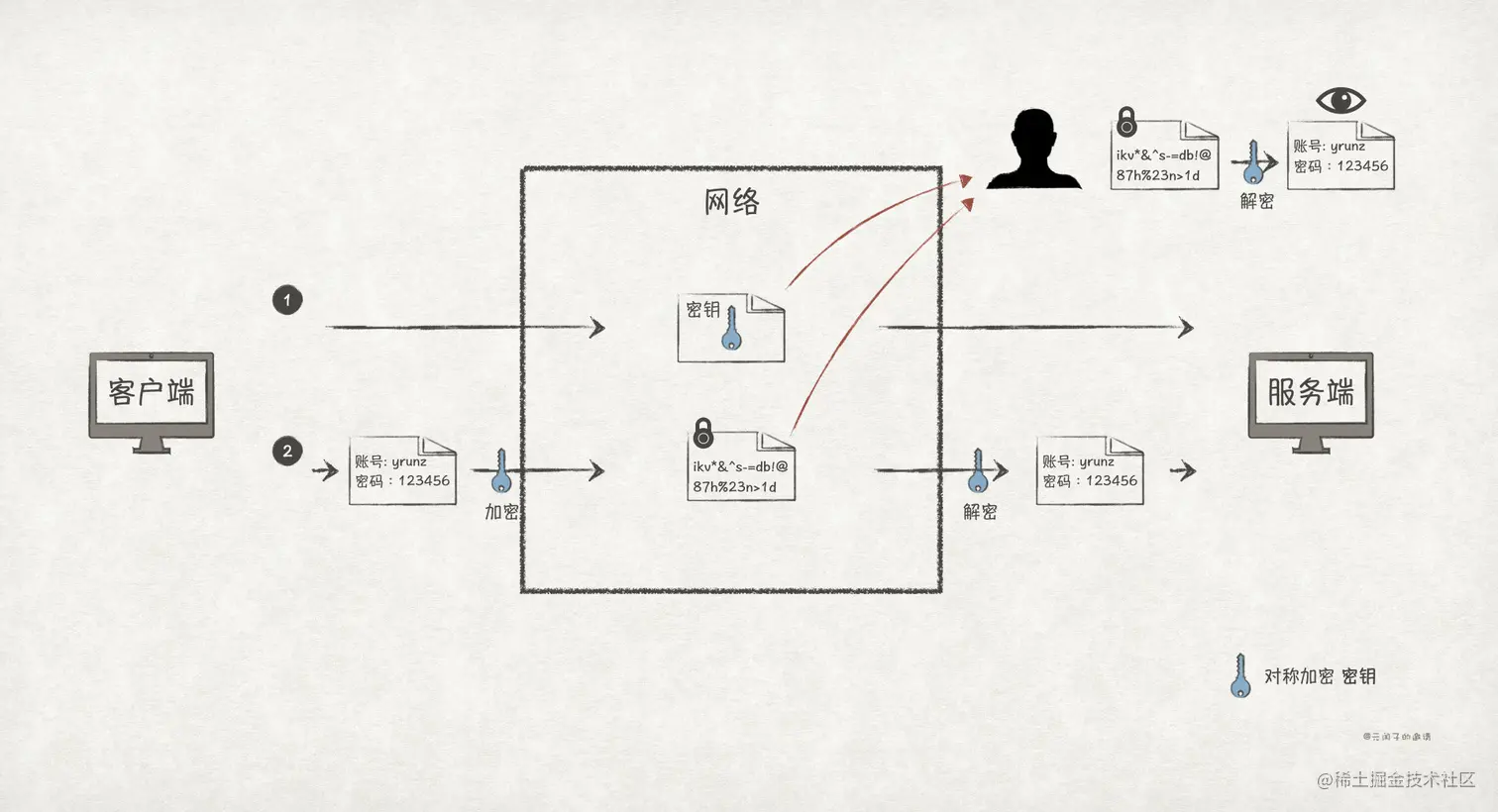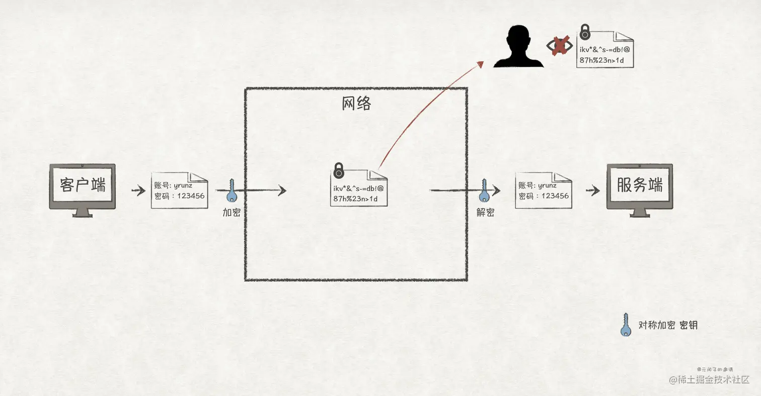 要解决窃听风险,就最好的方法就是对数据进行加密。也即客户端在把数据发送出去之前,先对数据进行加密;服务端收到密文之后,再进行解密还原数据。这样就能避免在网络上传播明文,从而可以防止第三方攻击者的窃听。