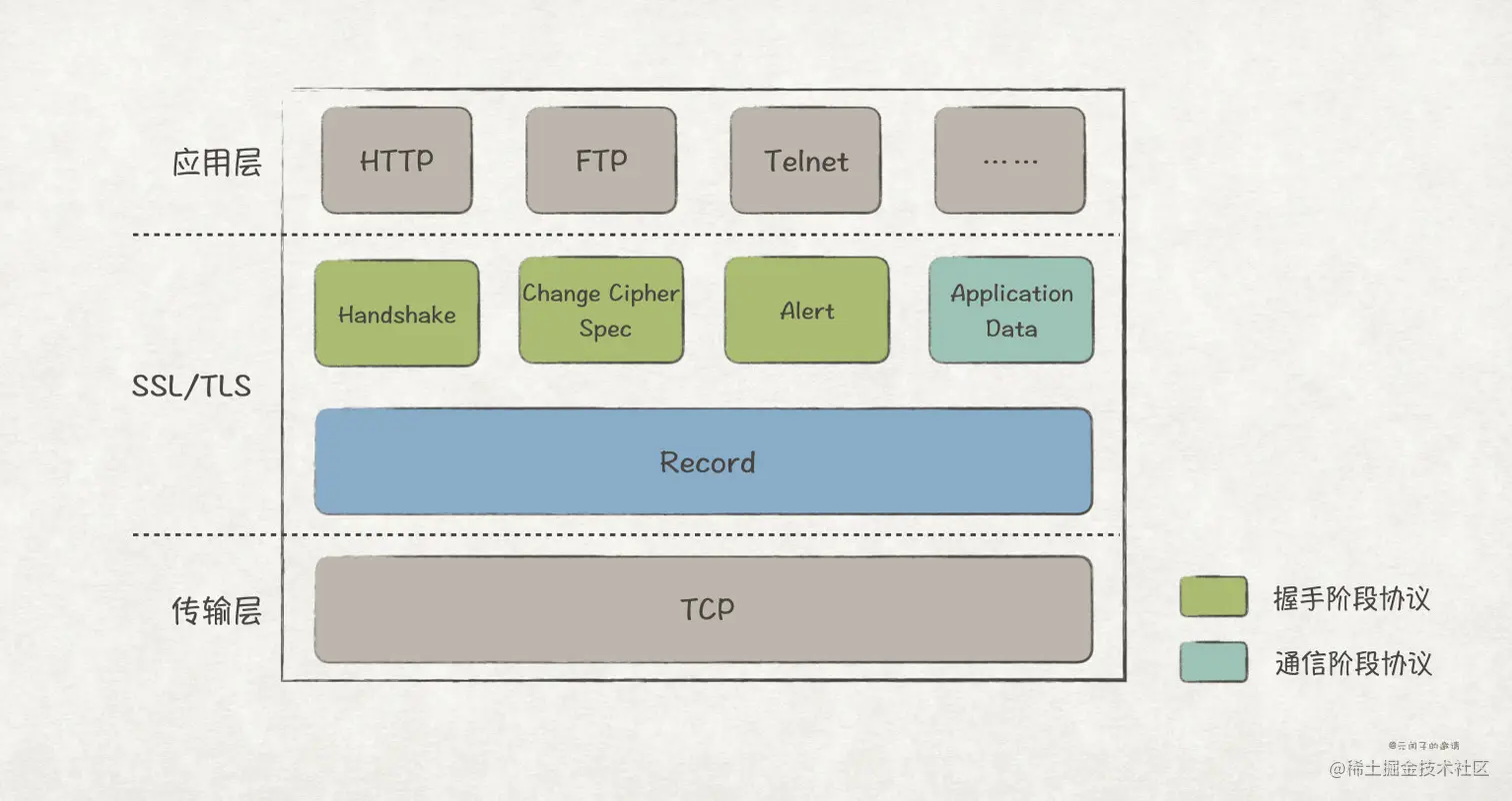 SSL/TLS 协议位于网络协议栈中传输层和应用层之间,它内部又可以分为 2 层,总共 5 种子协议: