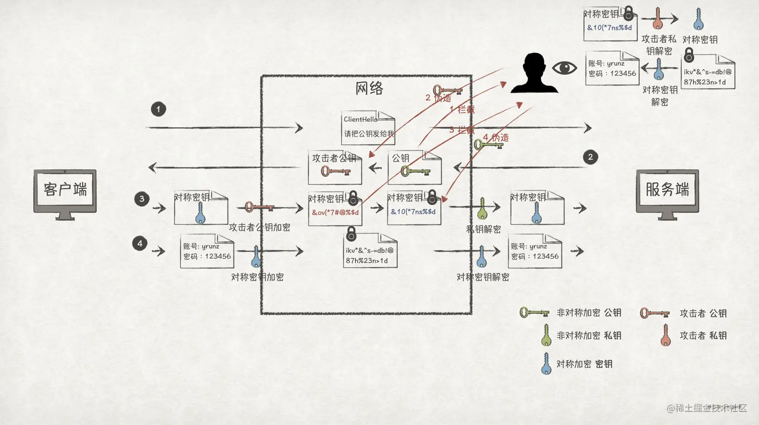 这番操作后,攻击者就能在客户端和服务端都不知情的情况下,得到了对称密钥。在这种场景下,攻击者从被动攻击的窃听,转为主动攻击的冒充,让客户端和服务端都误以为一直在跟对方通信。