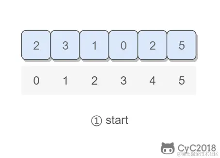 以 (2, 3, 1, 0, 2, 5) 为例,遍历到位置 4 时,该位置上的数为 2,但是第 2 个位置上已经有一个 2 的值了,因此可以知道 2 重复: