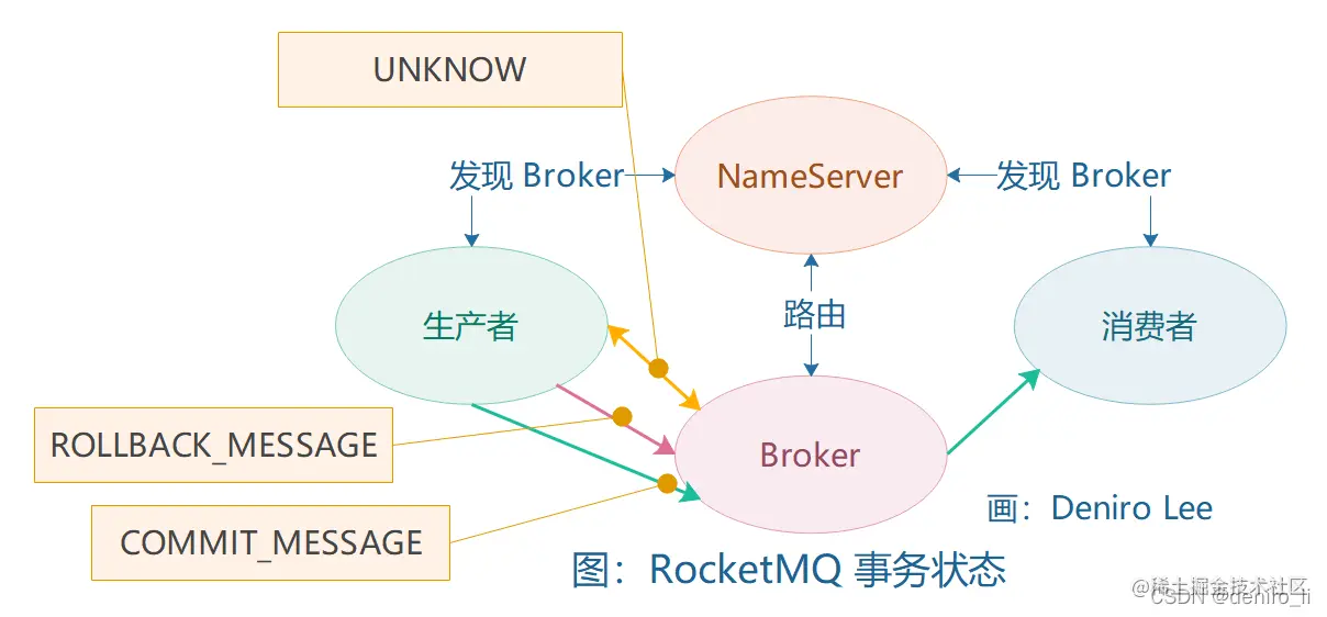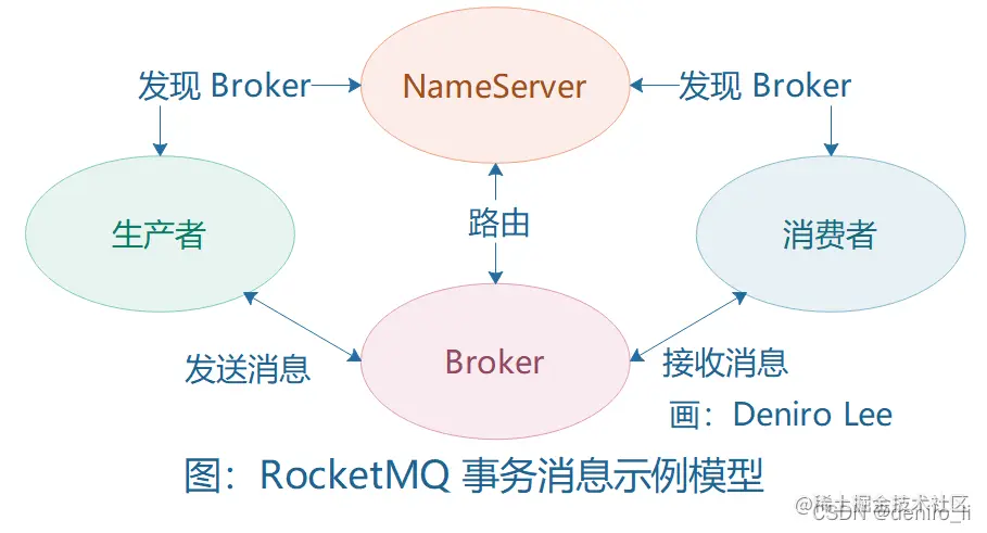 RocketMQ 事务消息示例包含一个生产者、消费者、NameServer 以及 Broker 服务,它们之间的关系如下: