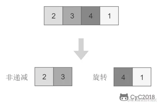 此时问题的关键在于确定对半分得到的两个数组哪一个是旋转数组,哪一个是非递减数组。我们很容易知道非递减数组的第一个元素一定小于等于最后一个元素。