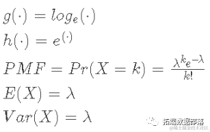 对于计数结果,我们使用对数链接函数和poisson的概率质量函数,或PMF。请注意,我们称之为概率质量函数而不是概率密度函数,因为支持是离散的(即对于正整数)。这些是