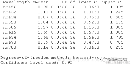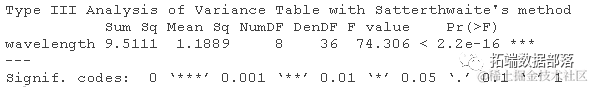 - 各个波长之间的差异是否显著?生成lmer对象的方差分析表。这里测试的是什么效应,随机效应还是固定效应?解释方差分析结果。