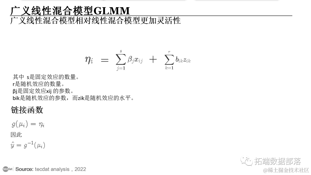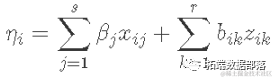 其中 s是固定效应的数量。r是随机效应的数量。βj是固定效应xij 的参数。bik是随机效应的参数,而zik是随机效应的水平。链接函数 g(μi)=η用来表示,这样 y=g(μi) . 因此,混合模型与广义线性混合模型的结合,形成广义线性混合模型。