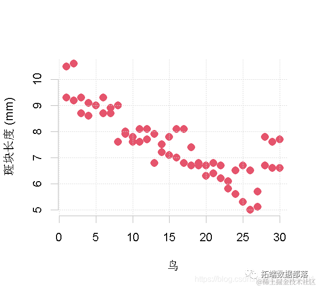 这第一个数据集是从Griffith和Sheldon(2001年,《动物行为学》61:987-993)的一篇论文中提取的,他们在两年内对瑞典哥特兰岛上的30只雄性领头鶲的白色额斑进行了测量。该斑块在吸引配偶方面很重要,但其大小每年都有变化。我们在这里的目标是估计斑块长度(毫米)。