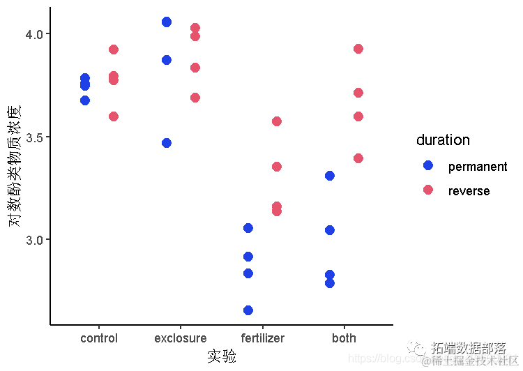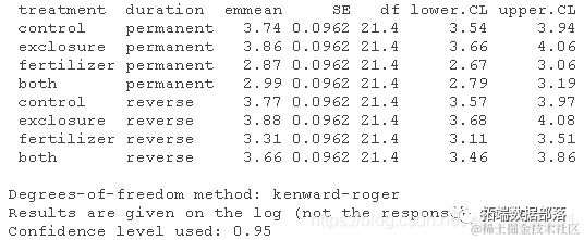 - 在没有实验和持续时间之间的交互作用的情况下,对数据进行线性混合模型拟合。使用酚类物质的对数作为因变量,因为对数转换改善了数据与线性模型假设的拟合。