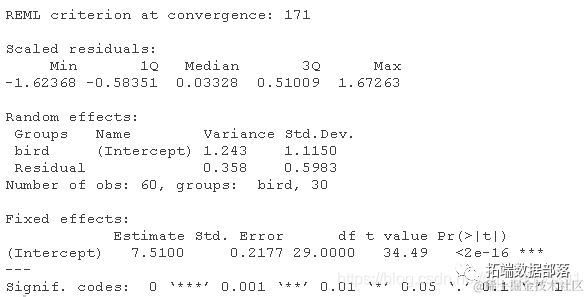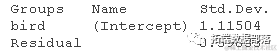 拟合一个线性混合效应模型。summary()的输出将显示两个随机变异的来源:单个鸟类之间的变异(鸟类截距),以及对同一鸟类进行的重复测量之间的变异(残差)。每个来源都有一个估计的方差和标准差。固定效应只是所有鸟类的平均值--另一个 "截距"。