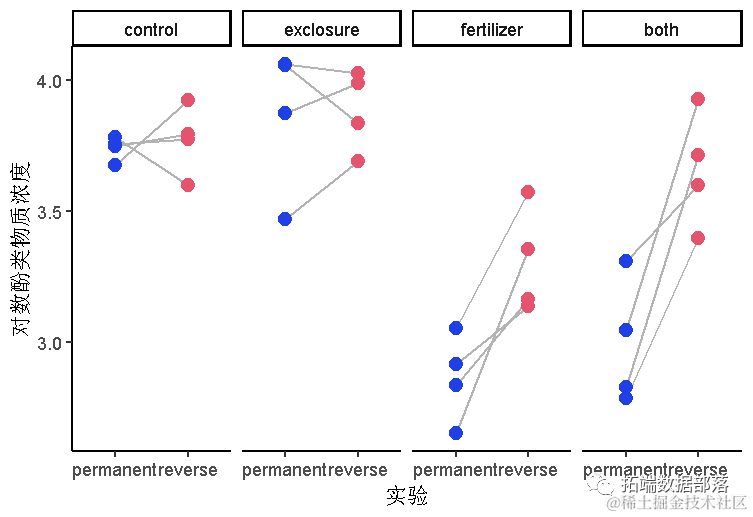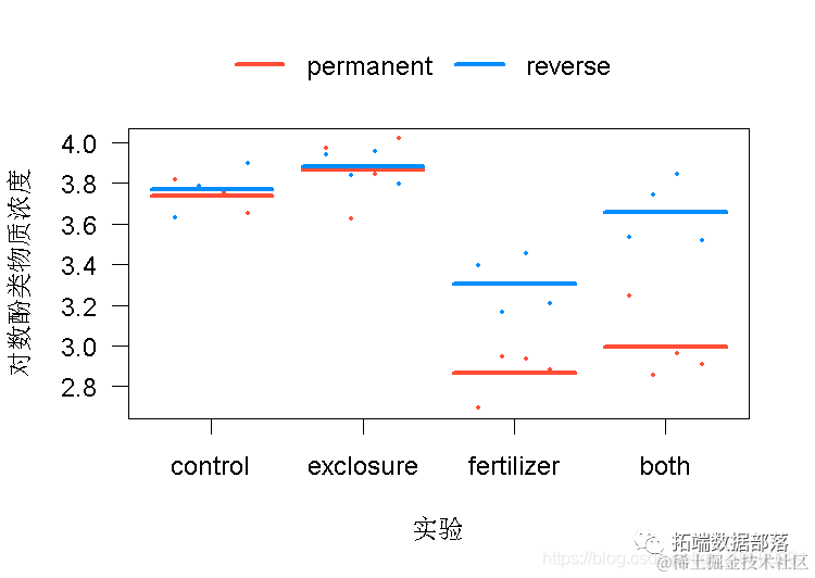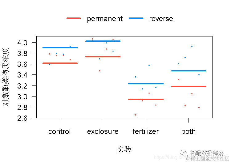 16个5x5米的小区中的每一个都被随机分配到四个实验之一。1)用栅栏围起来排除食草动物;2)用N-P-K肥料施肥;3)用栅栏和施肥;4)未实验的对照。然后,16块地中的每一块被分成两块。每块地的一侧(随机选择)在20年的研究中持续接受实验。每块地的另一半在头十年接受实验,之后让它恢复到未实验的状态。这里要分析的数据记录了欧蓍草(Achillea millefolium)中酚类物质的浓度(对植物防御化合物的粗略测量),欧蓍草是地块中常见的草本植物。测量单位是每克干重毫克丹宁酸当量。