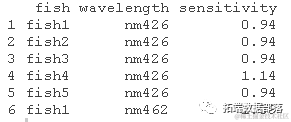 Cronly-Dillon和Muntz(1965; J. Exp. Biol 42: 481-493)用视运动反应来测量金鱼的色觉。在这里,我们将对数据进行拟合,包括测试的全部波长。5条鱼中的每一条都以随机的顺序在所有的波长下被测试。敏感度的值大表明鱼可以检测到低的光强度。视运动反应的一个重要特点是,鱼不习惯,在一个波长下的视觉敏感度的测量不太可能对后来在另一个波长下的测量产生影响。
