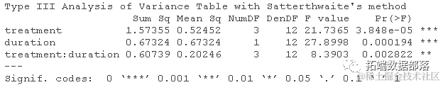 - 生成固定效应的方差分析表。哪些项在统计学上是显著的?