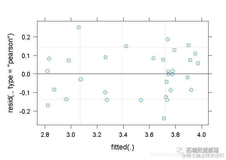 - 检查随机效应的输出。我们的混合效应模型中再次出现了两个随机误差的来源。它们是什么?其中哪个对应于输出中的"(截距)",哪个对应于 "残差"?注意,在这个数据集中,其中一个变化源的估计标准差非常小。这就是畸形拟合信息背后的原因。鱼类之间的方差不太可能真的为零,但是这个数据集非常小,由于抽样误差,可能会出现低方差估计。
