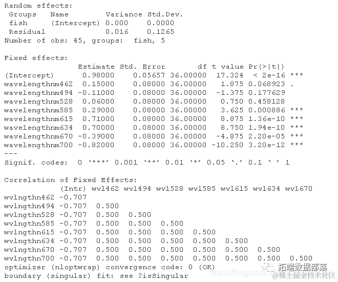 - 对数据拟合一个线性混合效应模型。可以用lmer()来实现。发现“畸形拟合”,“boundary (singular) fit: see ?isSingular