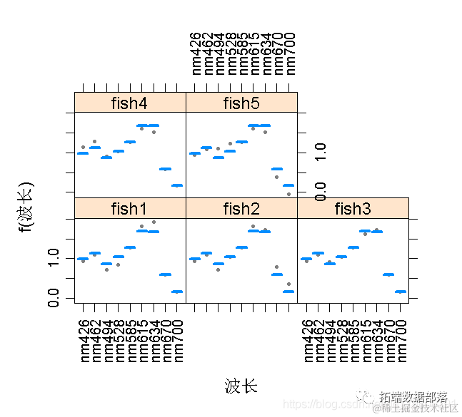 - 使用交互图来比较不同光波长实验下的个体鱼的反应。