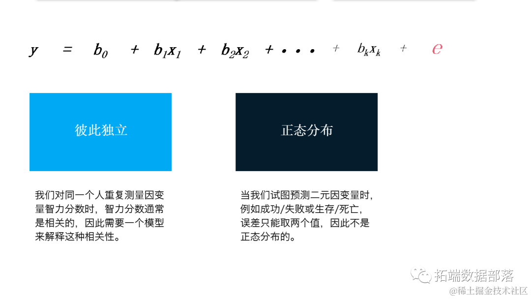 对于线性回归模型,我们需要假设误差是正态分布的并且彼此独立。自然,严重违反这些假设将导致统计模型几乎没有用处。