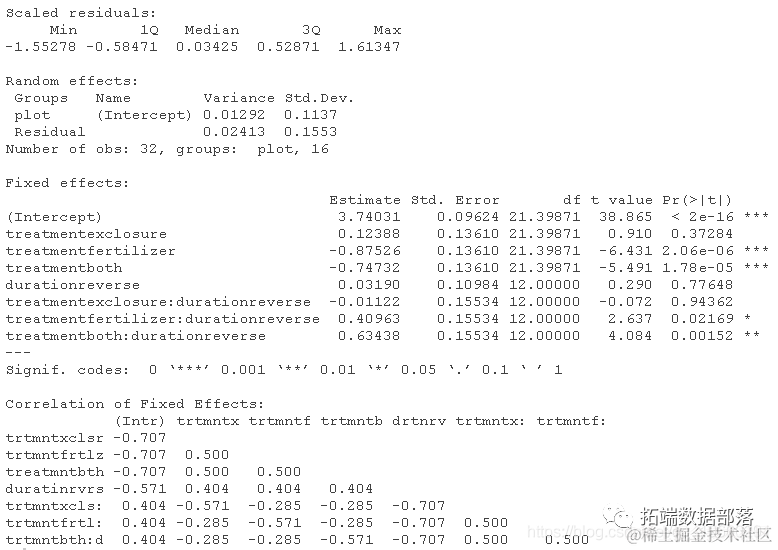 由于随机效应也存在(块),系数表将显示两个随机变化来源的方差估计。一个是拟合模型的残差的方差。第二个是(随机)块截距之间的方差。