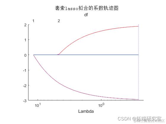 虚线代表最小均方误差的Lambda值(在右边),以及最小均方误差加一个标准差的Lambda值。后者是Lambda的一个推荐设置。这些线条只在你进行交叉验证时出现。通过设置'CV'名-值对参数来进行交叉验证。这个例子使用了10折的交叉验证。