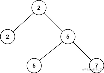 给定一个非空特殊的二叉树,每个节点都是正数,并且每个节点的子节点数量只能为 2 或 0。如果一个节点有两个子节点的话,那么该节点的值等于两个子节点中较小的一个。