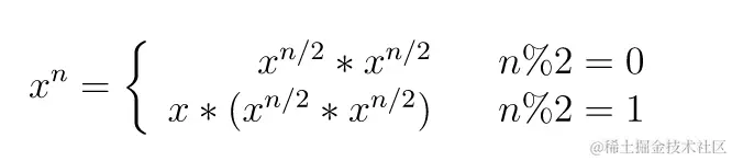 最直观的解法是将 x 重复乘 n 次,x*x*x...*x,那么时间复杂度为 O(N)。因为乘法是可交换的,所以可以将上述操作拆开成两半 (x*x..*x)* (x*x..*x),两半的计算是一样的,因此只需要计算一次。而且对于新拆开的计算,又可以继续拆开。这就是分治思想,将原问题的规模拆成多个规模较小的子问题,最后子问题的解合并起来。